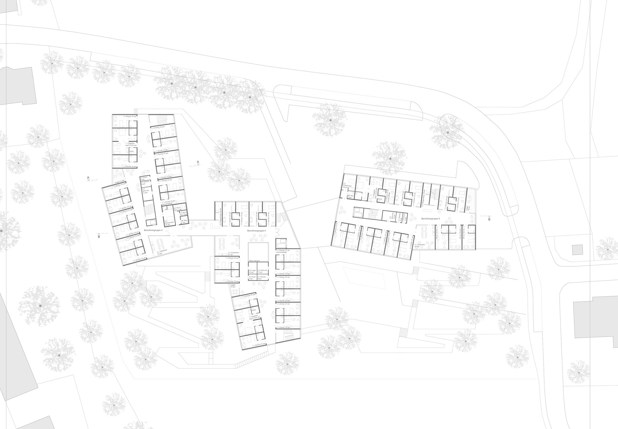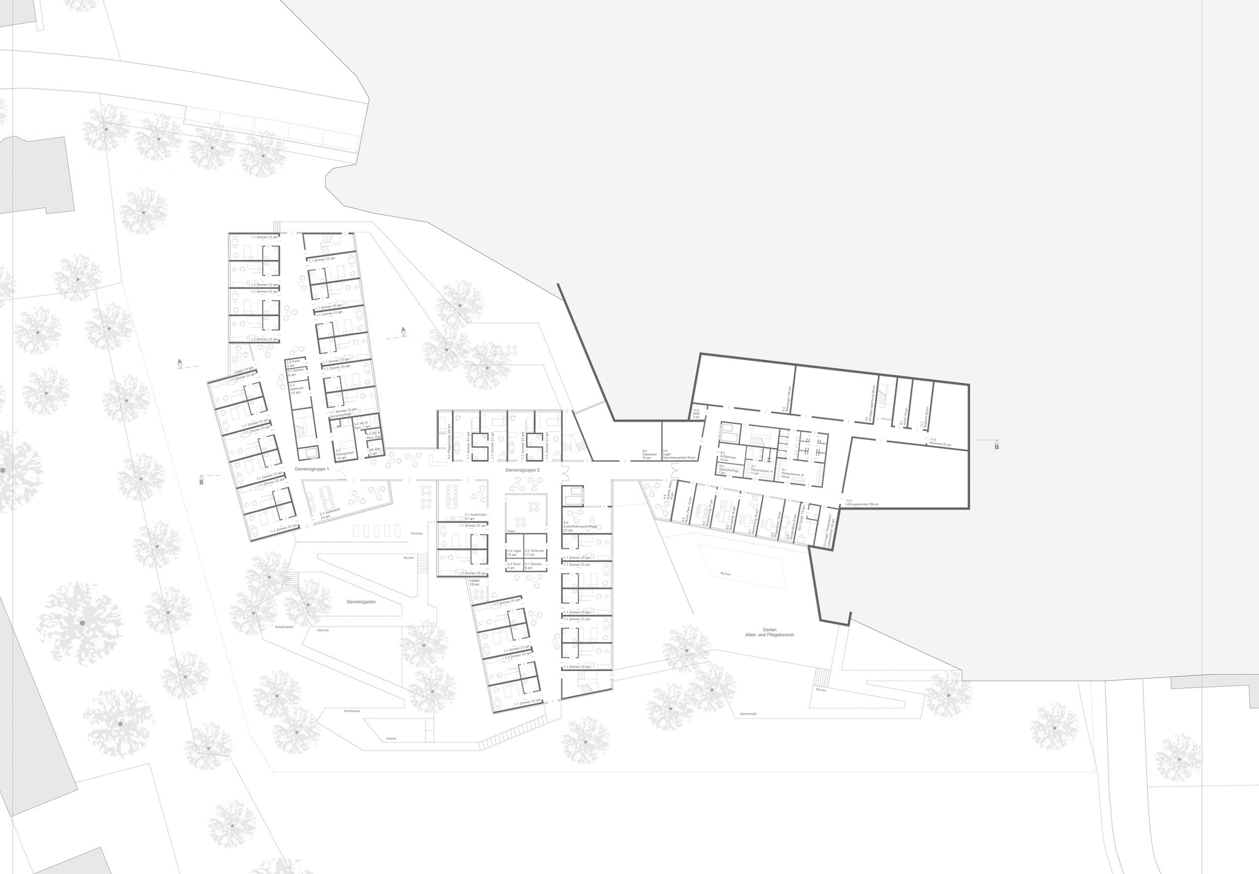 Der Demenzbereich ist als abgeschlossener, gut orientierbarer Lebensraum mit direktem Außenbezug gestaltet. Zwei Gruppen sind bewusst miteinander verbunden, um mehr Bewegungsfreiheit zu ermöglichen. Die Wegeführung vermeidet Sackgassen und leitet die Bewohner immer wieder zurück ins zentrale Tageszentrum.