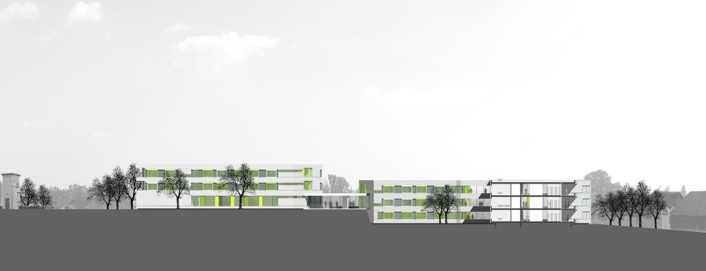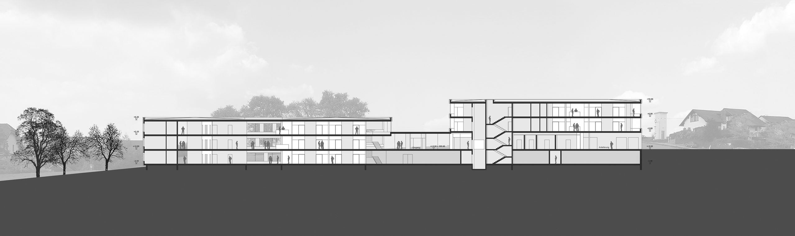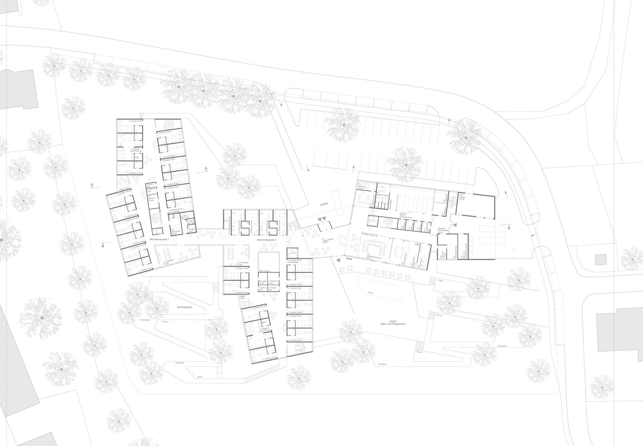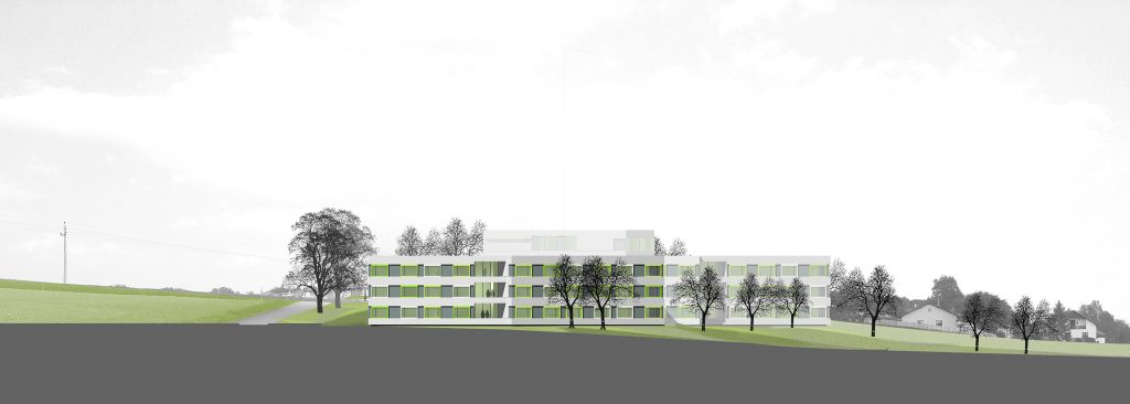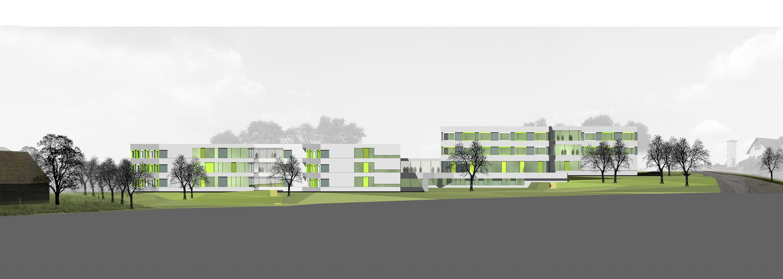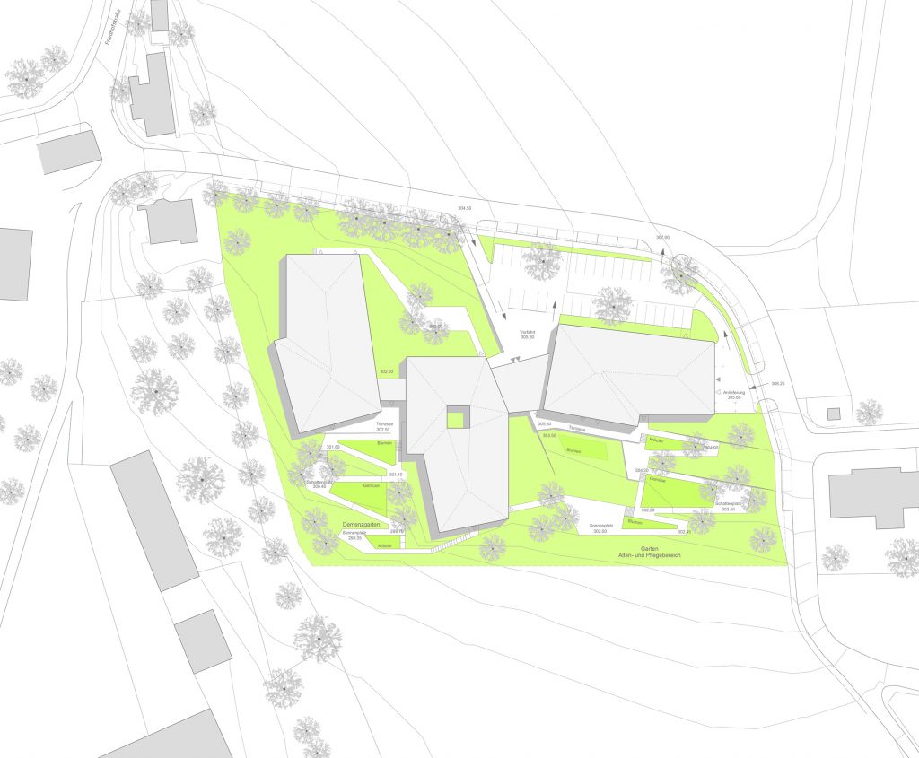 Das neue Alten- und Pflegeheim am Ortsrand nutzt die besondere landschaftliche Lage mit ihrer natürlichen Topografie und den weiten Ausblicken optimal aus. Die kompakte und klar gegliederte Bauweise fügt sich behutsam in die Umgebung ein und ermöglicht eine hohe Aufenthaltsqualität für Bewohner:innen, Besucher:innen und Personal. Die differenziert gestalteten Außenräume sowie die übersichtlich strukturierten Wohngruppen schaffen eine wohnliche Atmosphäre, die sowohl Geborgenheit als auch Orientierung bietet. Neben den Pflege- und Gemeinschaftsbereichen stehen großzügige Gartenflächen, ein geschützter Dementenbereich sowie öffentliche Einrichtungen wie Cafeteria, Friseur oder Gymnastikraum zur Verfügung. Das Gesamtkonzept verbindet funktionale Anforderungen mit hoher architektonischer und landschaftlicher Qualität und schafft so einen Ort der Ruhe, Begegnung und Würde im Alter.