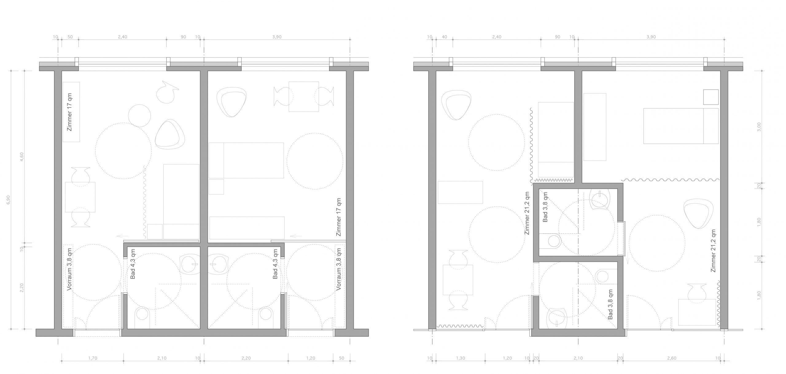 Grundriss Bewohnerzimmer: Typ „Standard“ und Typ „Kommunikation“