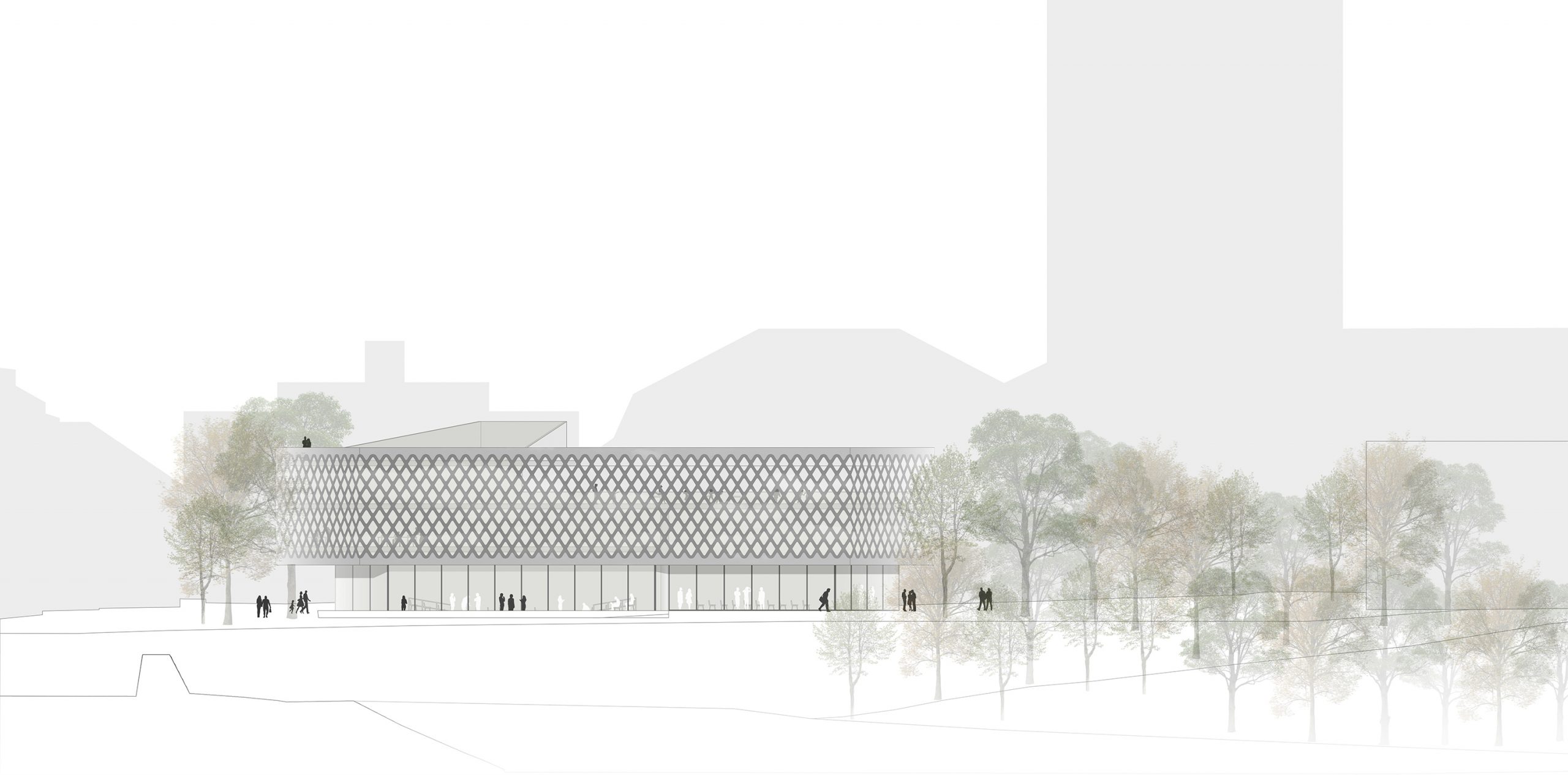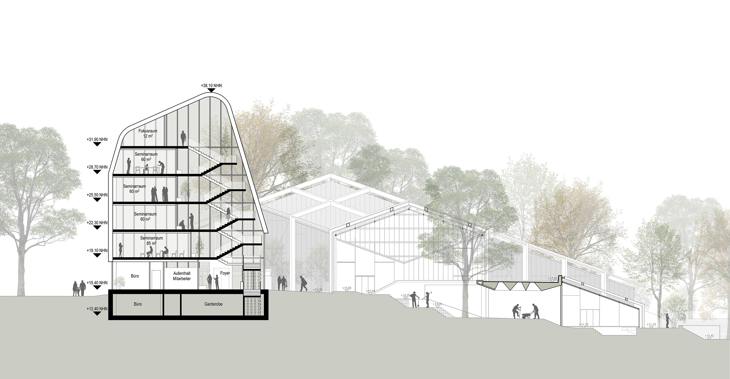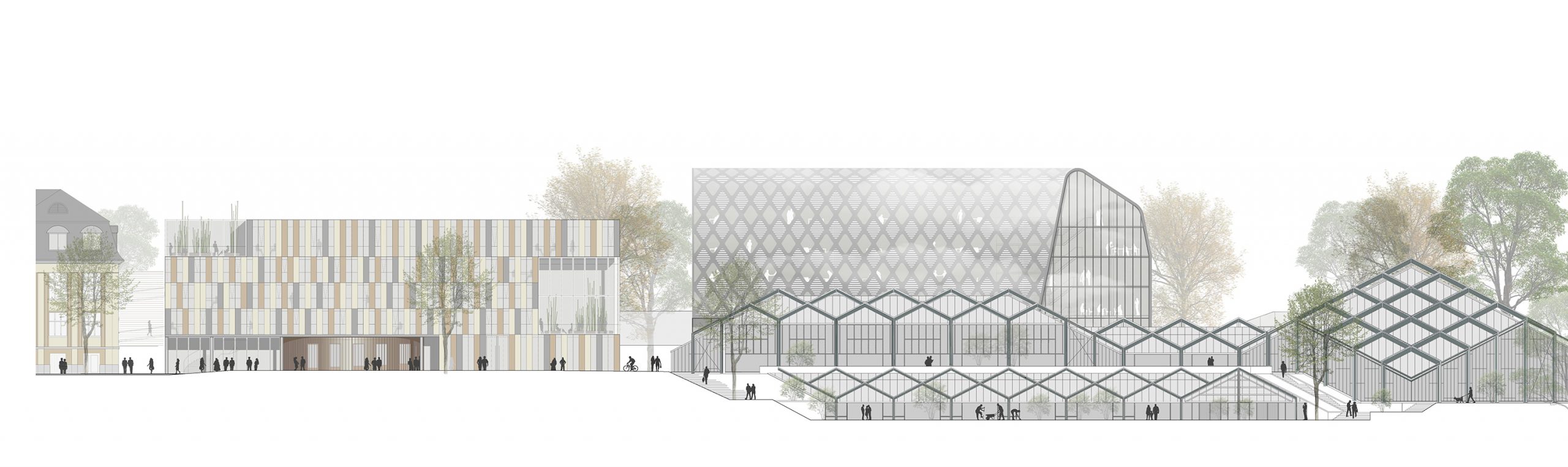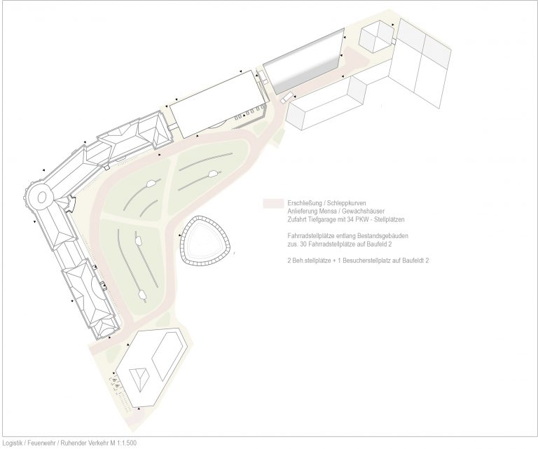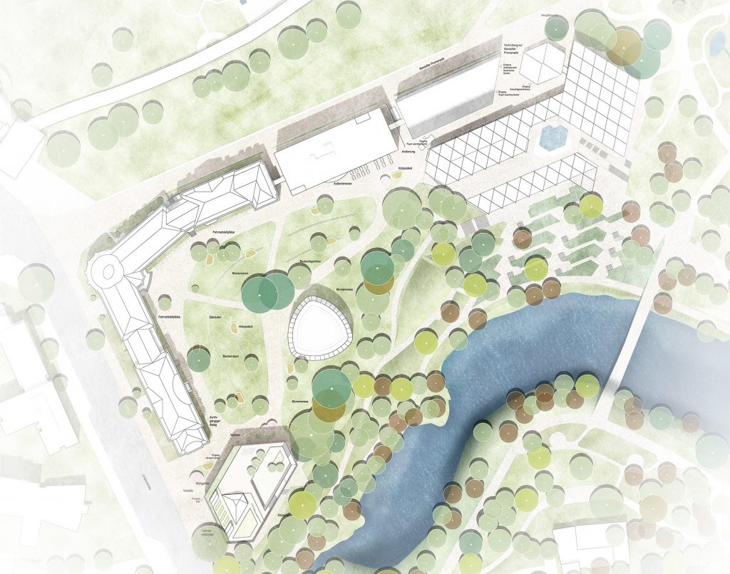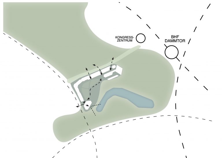 Die Architektur antwortet auf die besondere Lage im Park mit Zurückhaltung und Klarheit. Beide Neubauten sind nicht laut, sondern offen – keine Landmarken im klassischen Sinne, sondern feingliedrige Strukturen, die Verbindungen ermöglichen: zwischen Stadt und Hochschule, zwischen öffentlichem Raum und akademischem Leben, zwischen Lernen, Austausch und Aufenthalt im Grünen.