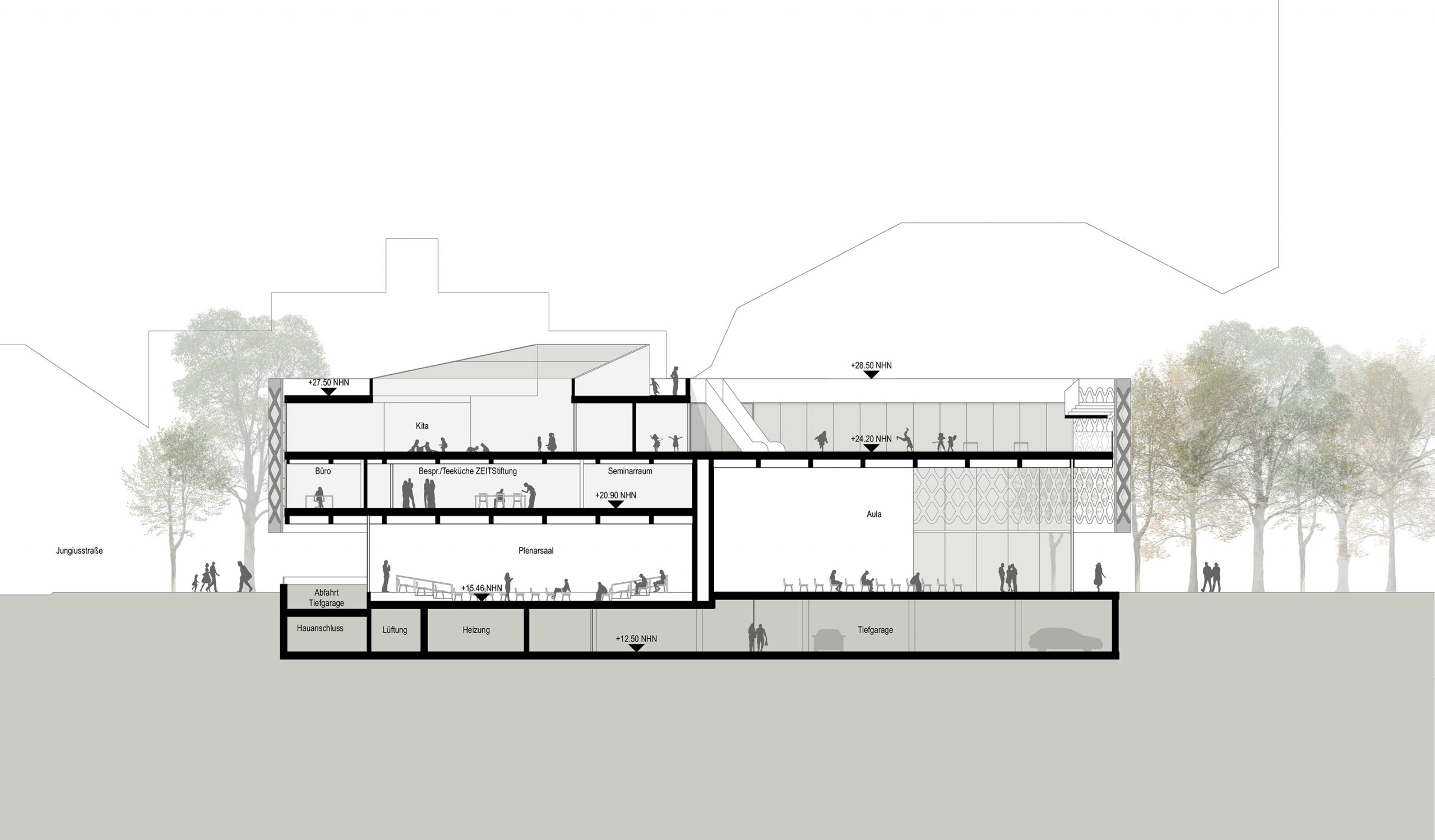 Mit der geplanten Erweiterung erhält die Bucerius Law School die Chance, sich räumlich wie inhaltlich neu in der Stadt zu verorten. Besonders der Standort an der Jungiusstraße öffnet das bislang eher inselartige Hochschulareal in Richtung Innenstadt. Hier entsteht ein Forum für öffentliche Debatten, das akademische Inhalte sichtbarer macht und die Hochschule stärker als Teil des gesellschaftlichen Lebens positioniert. Architektur und Landschaft treten dabei gemeinsam auf: Der Campus wird nicht nur funktional ergänzt, sondern atmosphärisch aufgewertet – als grüner, durchlässiger Lern- und Lebensraum inmitten Hamburgs.