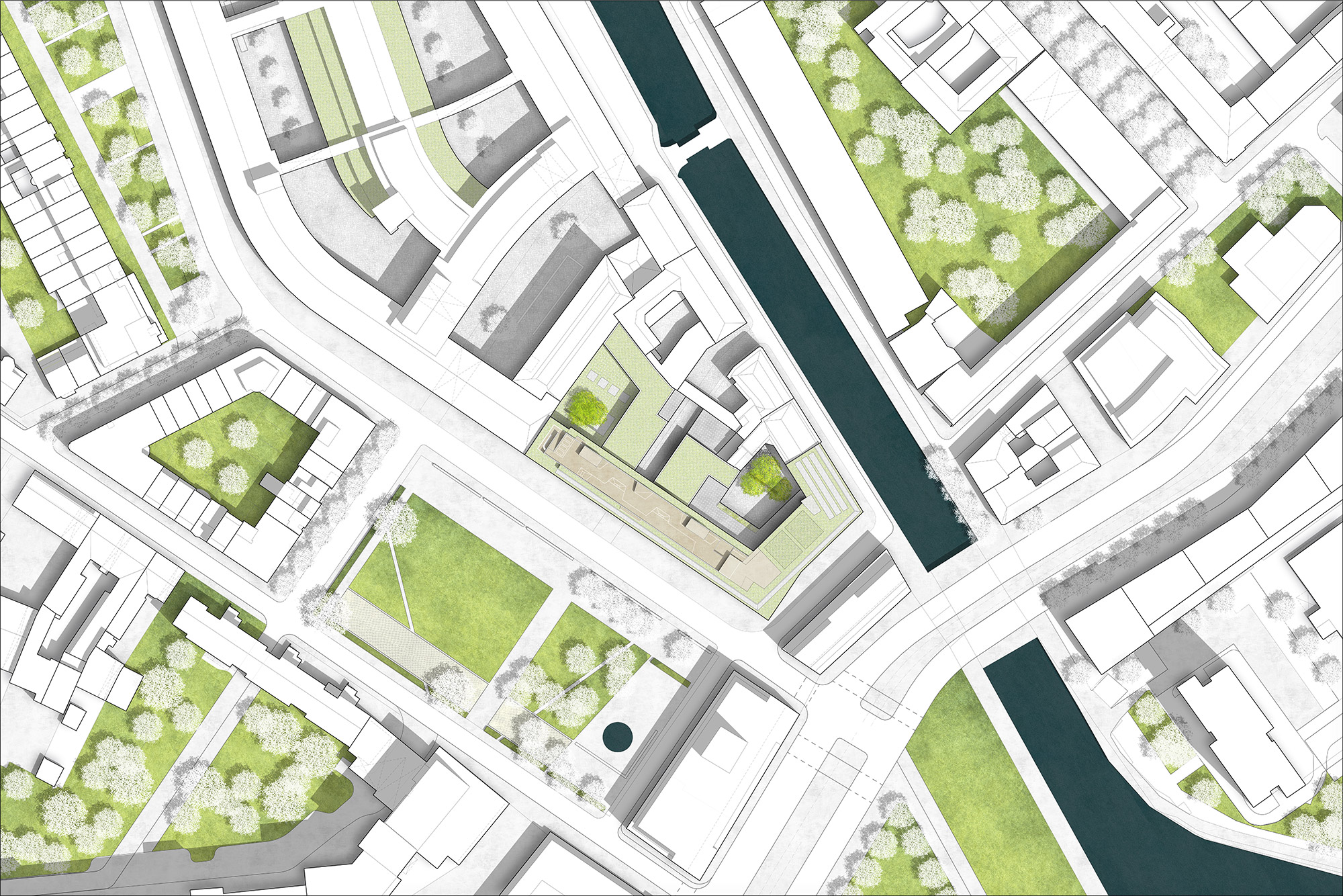Städtebaulich anspruchsvoll durch dieVorgabe derWiederherstellung ei- ner kleinen Querstraße durch das Gelände inkl.Anschluss an ein kürzlich entstandenes Brückengebäude (Rolf Mühlethaler).