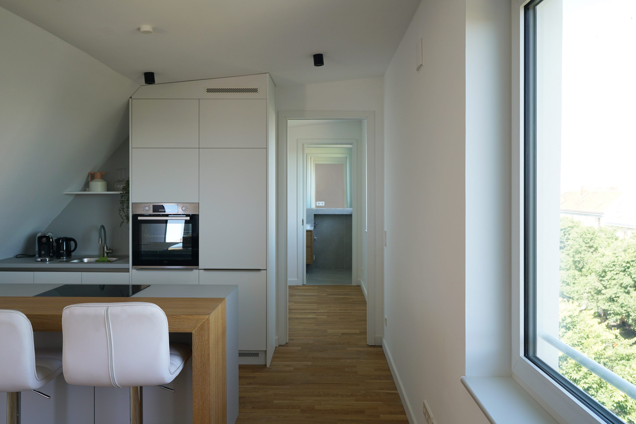 Die städtebauliche Situation ist durch eine große Abfolge von Brandwandfassaden an der Flughafenstraße geprägt, die im Zuge der Strassenverbreiterung für den Flughafen Tempelhof entstanden sind. Wir setzen in die Brandwandfassade eine freie und irreguläre Anordnung von unterschiedlich großen Fenstern und wollen damit die Sonderform eben dieser Brandwandfassaden betonen, im Neubau wie auch im Dachausbau. Das stadtplanerisch zulässige Maß der Nachverdichtung bestimmt die Dichte der Bebauung. So entstehen im Neubau sehr kompakte Wohnungen, 1 bis 2 Wohnungen pro Etage, mit jeweils 1 bis 3 Zimmern. Gleichzeitig ist der Neubau nur ca. 7m tief und alle Wohnungen sind beidseits belichtet und belüftet. Großzügige Balkone zur sonnigen und ruhigen Innenhofseite ergänzen die sehr kompakten Wohnungen. Im Dachausbau mit seiner typischen Berliner Dachform entwickeln sich die neuen Wohnungen um neue eingeschnittene Dachterrassen zum Innenhof. Alle Wohnungen im Neubau und Ausbau sind zweiseitig belichtet, zu Straße und Innenhof.