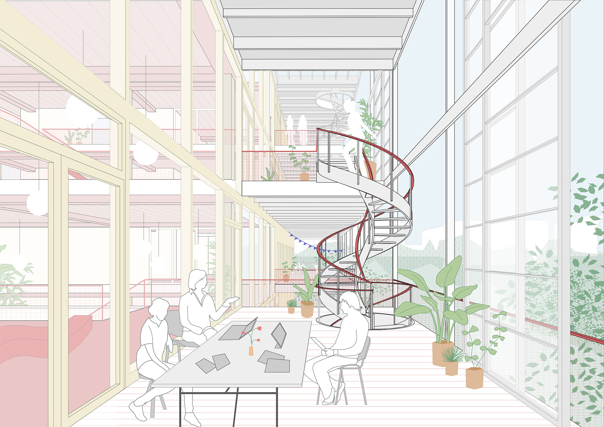 Das transparente, bewusst niedrigschwellige Gebäude fügt sich in die Blockrandbebaung ein und öffnet sich adressbildend zur Straßenecke wie auch zum 1 Etage höher liegenden Park auf der Gartenseite. Das mehrgeschossige Foyer eröffnet eine Kaskade von fünf miteinander kommunizierenden zweigeschossigen „Zwischenräumen“, durch die offene Treppen bis auf die begrünte Dachterrasse führen. Sie nehmen in den unteren Ebenen öffentliche Funktionen wie Entrée und Restaurant auf, weiter oben finden sich halböffentliche Flächen, die sich die Nutzer:innen als Arbeits- und Workshopräume aneignen können. En passant wird hier das Interesse geweckt an allen möglichen Aktivitäten im Gebäude. Vorbeiflanieren, beiläufig partizipieren, zufällig beobachten – über die offenen Galeriebrüstungen ergeben sich vielfältige Blickbeziehungen. Auch angrenzende Funktionsräume lassen sich in das Geschehen mit einbinden, sodass Veranstaltungen räumlich wie inhaltlich zusammenhängend vom Erdgeschoss bis ins Dachgeschoss entwickelt werden können, z.B. für ein „Festival der Jugend“.