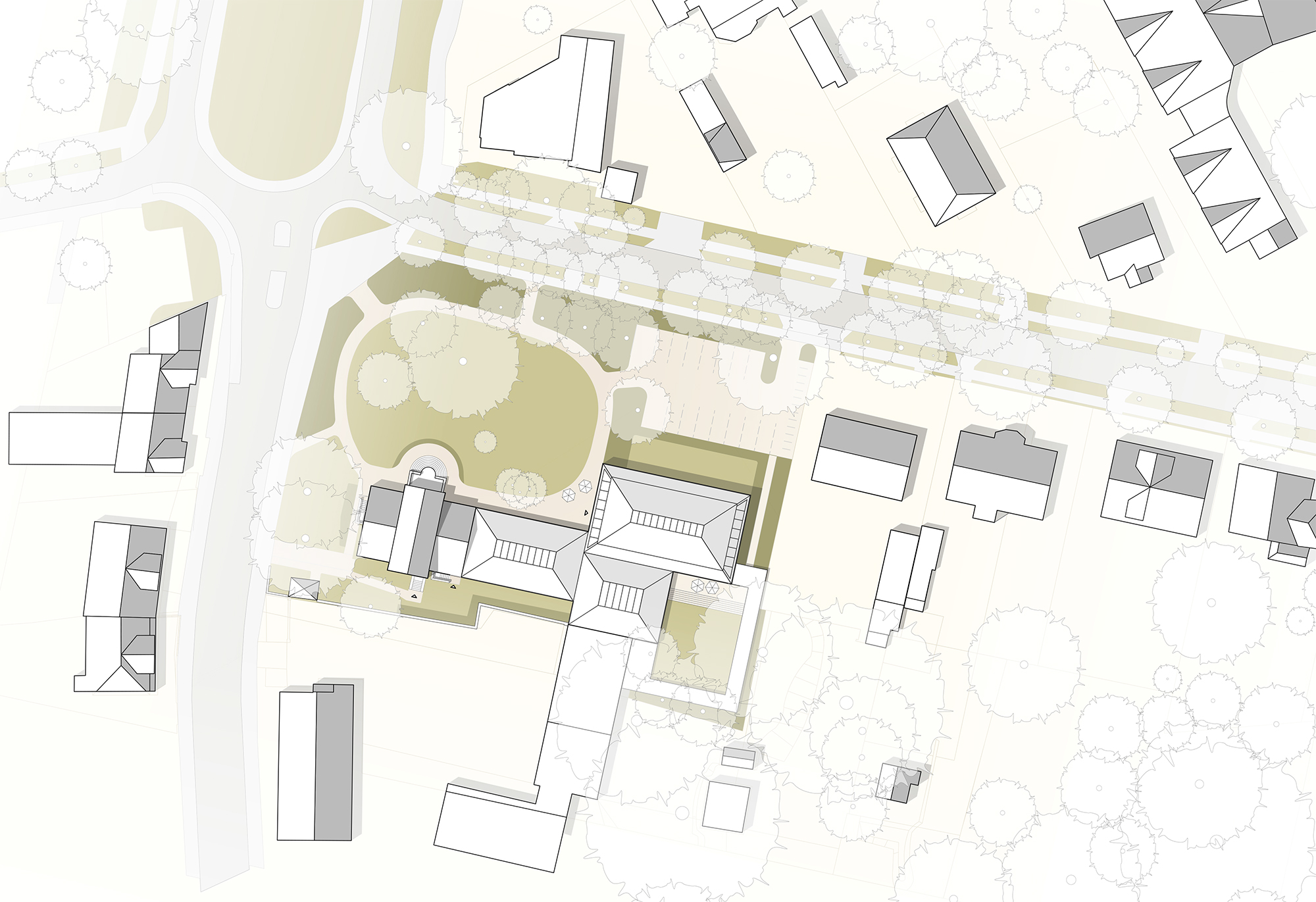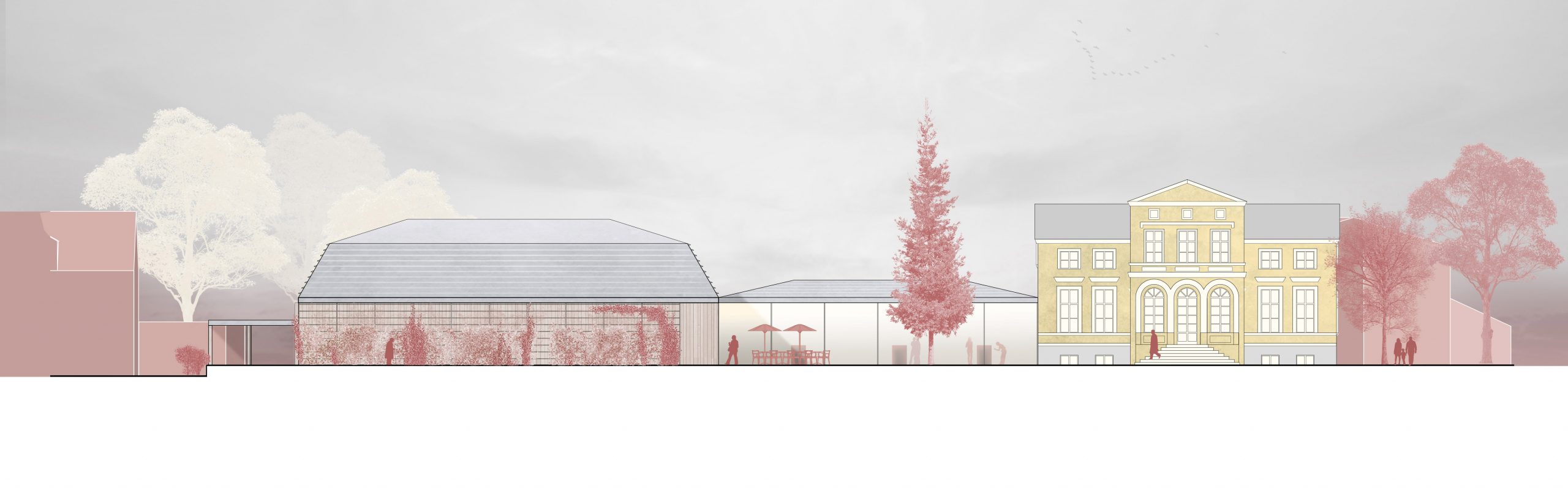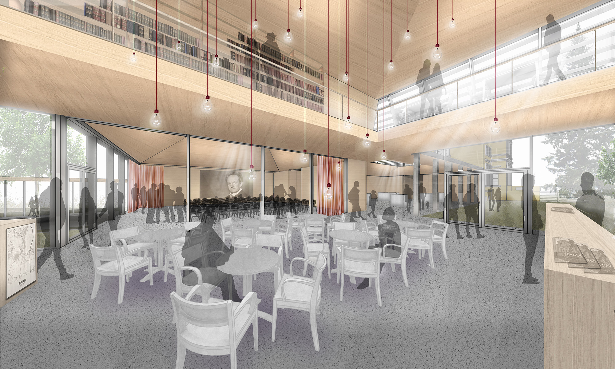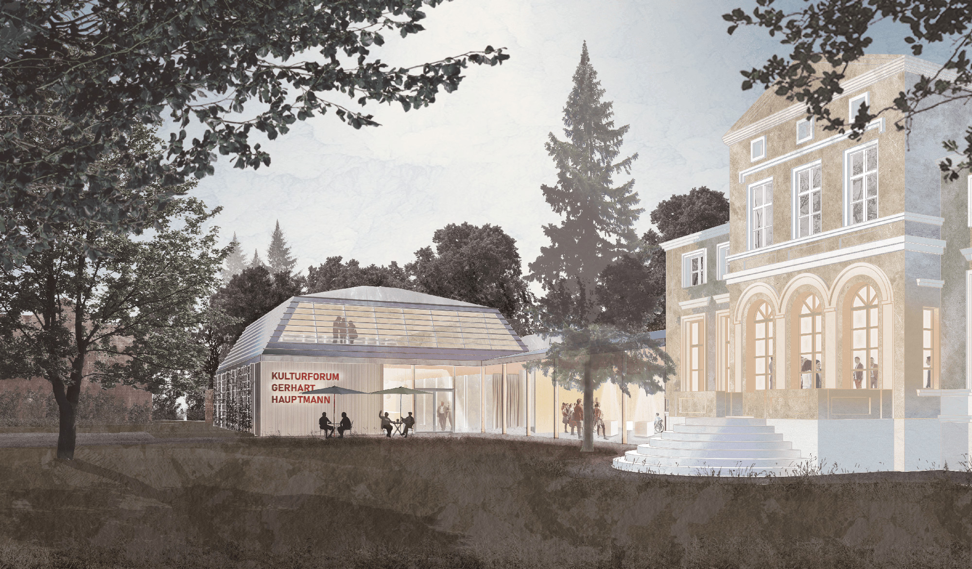 Das neue Kultur- und Bildungsforum entwickelt sich als Ensemble aus denkmalgeschützter Villa und einem eigenständigen, zurückhaltend formulierten Erweiterungsbau. Es entsteht ein lebendiger Ort des Austauschs für Erkner – ein offenes Haus für Literatur, Bildung und Begegnung. Der Neubau fügt sich selbstverständlich in die historische Gartenanlage ein und bewahrt die Sichtachsen zur Villa, die dadurch selbst zum musealen Objekt im Stadtraum wird. In Anlehnung an klassische Gartenarchitekturen – Schinkel, Goethe, Hauptmann auf Hiddensee – entwickelt sich der Erweiterungsbau als pavillonartiges Gefüge mit kleinteiligen Walmdächern, verglasten Laubengängen und großzügigem Außenraumbezug. Durch die differenzierte Dachlandschaft und den gezielten Einsatz von Holz als Baumaterial entsteht ein wohltuend maßstäblicher, atmosphärischer Bau, der sich unterordnet, ohne sich zu verstecken.
