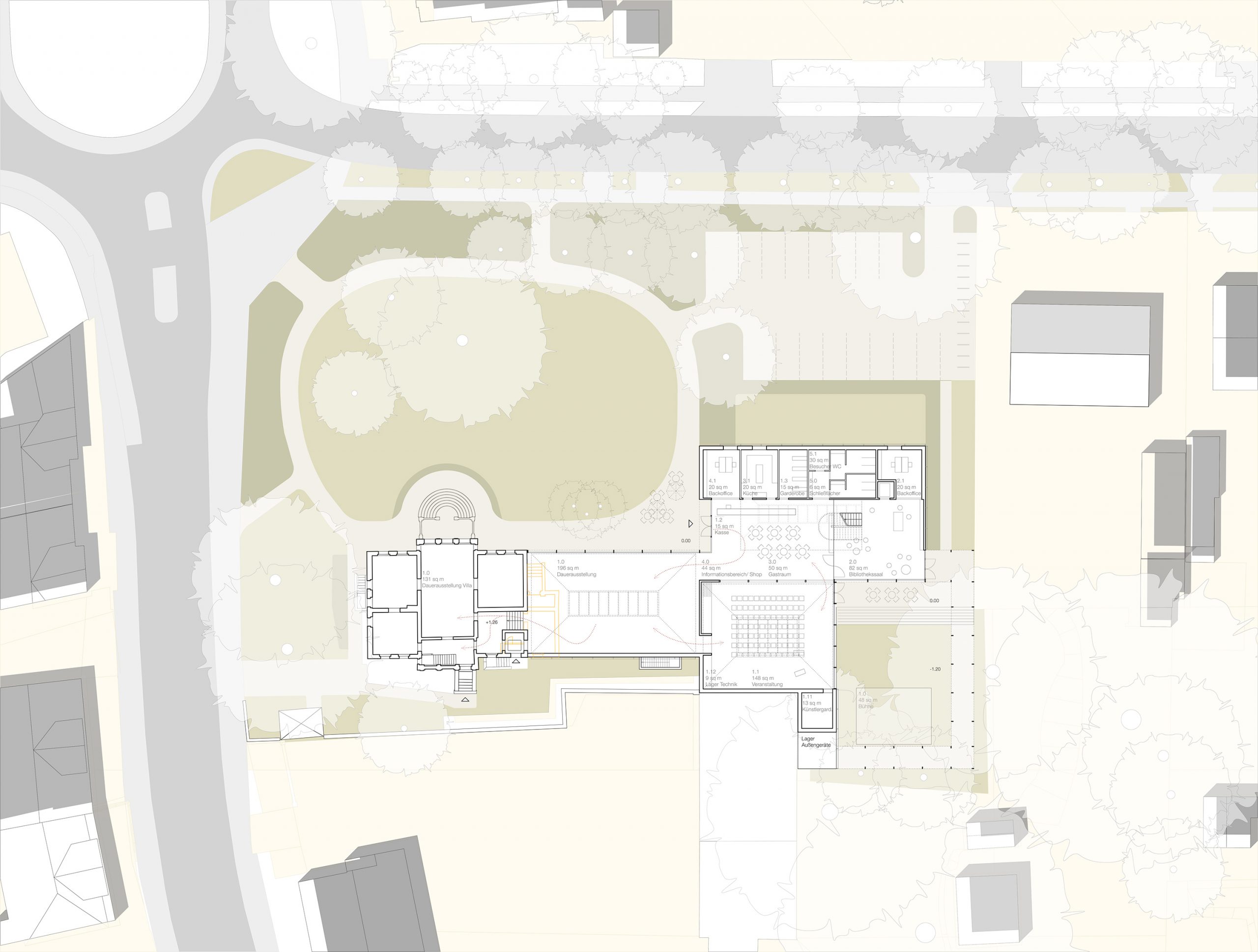 Im Inneren sind Bibliothek, Ausstellungs- und Veranstaltungsräume, Shop, Café und Tourist-Info in einem offenen, transparenten Raumgefüge organisiert, das vielfältige Synergien ermöglicht. Das große Foyer ist zugleich Schnittstelle und Aufenthaltsort, öffnet sich zum Garten und bietet Raum für Begegnung. Die Räume lassen sich unabhängig voneinander betreiben – etwa für Veranstaltungen oder in den Abendstunden. Auch der neue, von einer Pergola gerahmte Gartenhof erweitert das Nutzungsspektrum des Hauses: als Lesegarten, Café-Terrasse oder Spielort für Sommertheater. Die Villa bleibt in ihrer Struktur weitgehend erhalten, wird durch einen unauffällig eingefügten Aufzug vollständig barrierefrei erschlossen und in das Nutzungskonzept eingebunden. Der neue Baukörper bleibt kompakt, ressourcenschonend und zurückhaltend – ein leises, doch kraftvolles architektonisches Statement für ein zeitgemäßes Kulturhaus in Erkner.