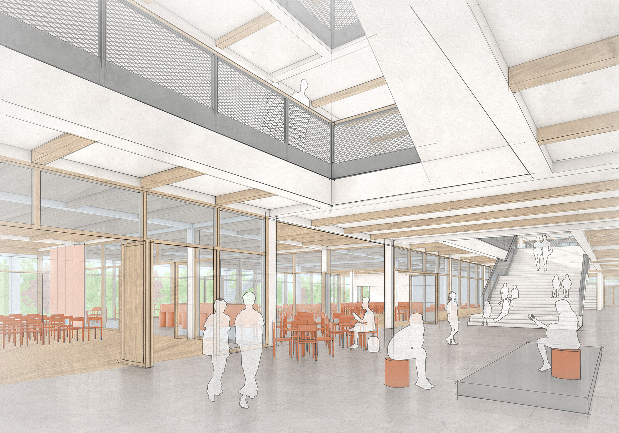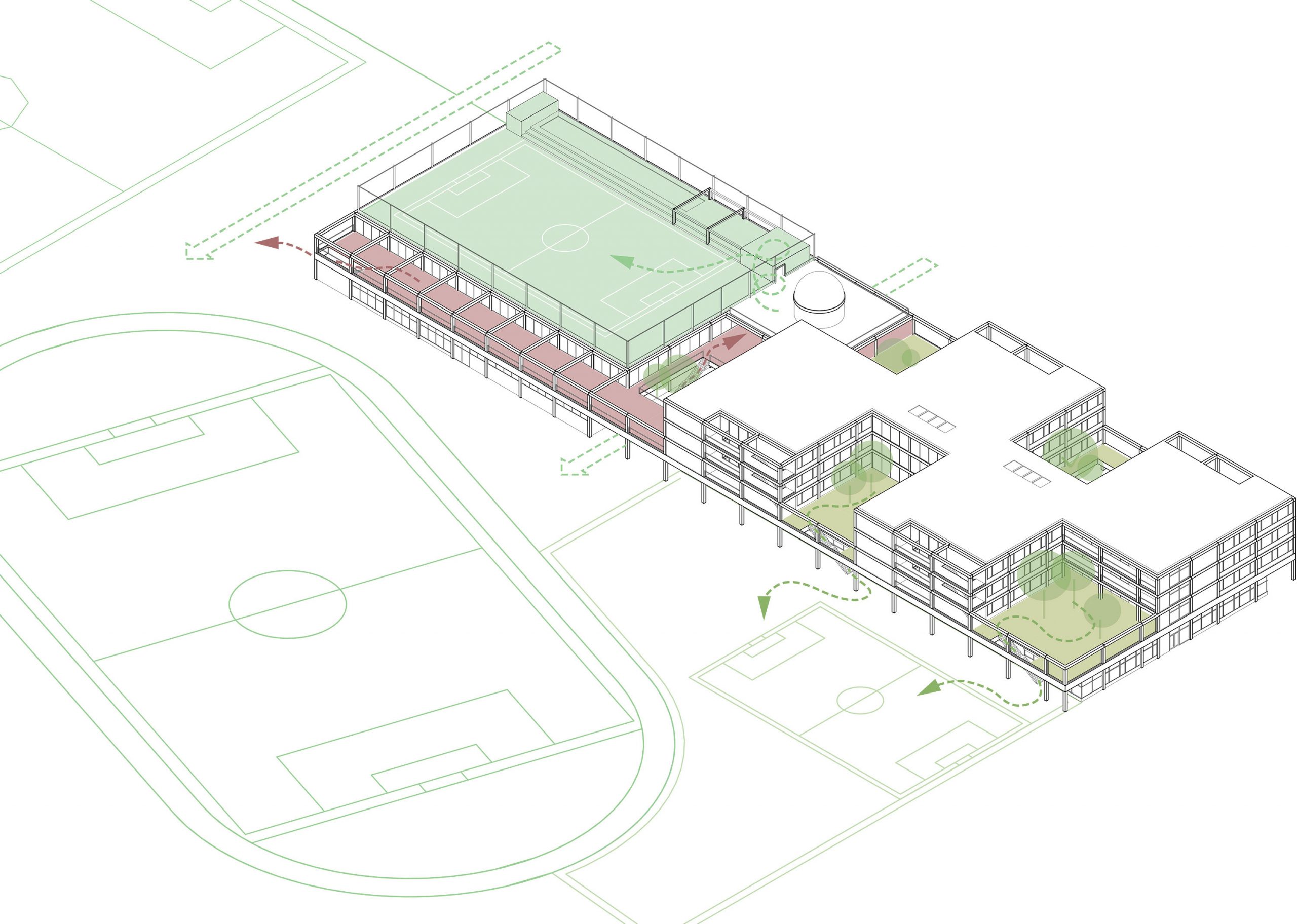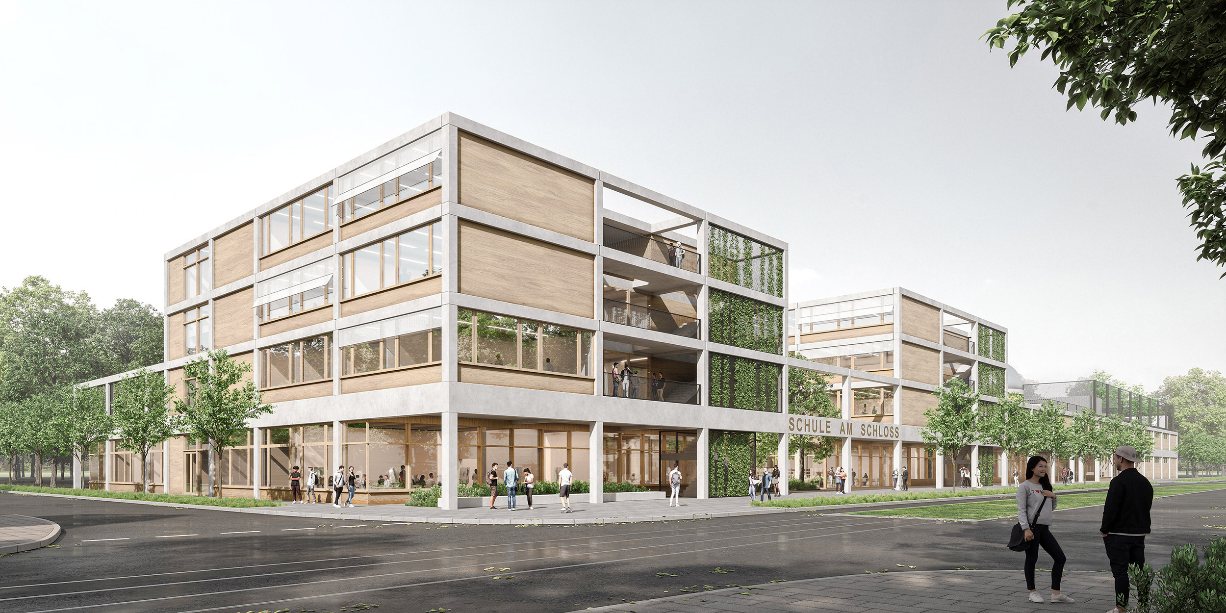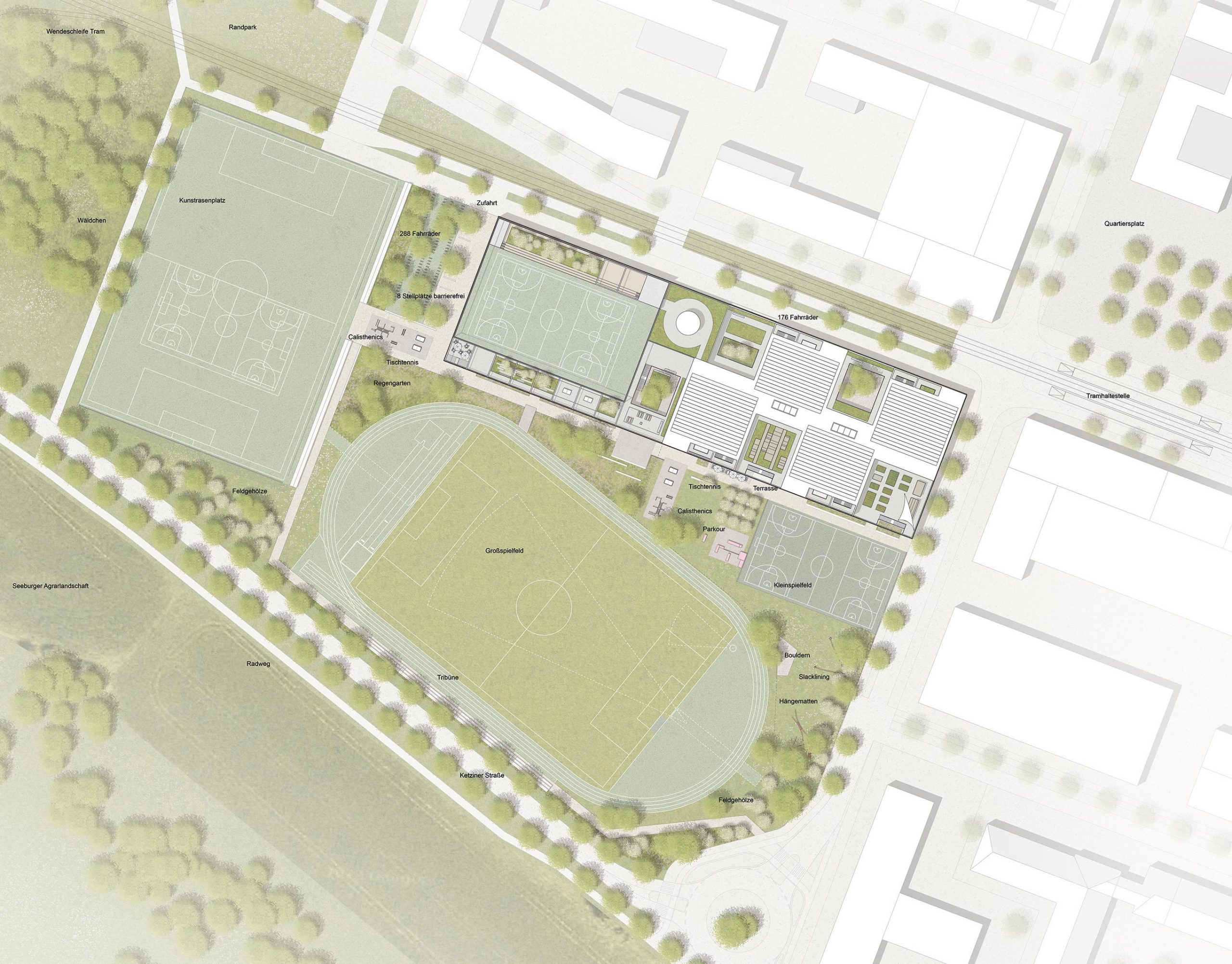 Außenflächen wie Schulhöfe, Terrassen, Schulgärten und ein Kleinspielfeld auf dem Hallendach bieten vielfältige Aufenthalts- und Nutzungsmöglichkeiten. Die Sporthalle mit Tribüne, öffentlichen Zugängen und separatem Sportfunktionsbereich ist sowohl schulisch als auch außerschulisch nutzbar. Die insgesamt kompakte Organisation des Neubaus schafft einen funktional und räumlich gut vernetzten Bildungsort, der auf Flexibilität, Nachhaltigkeit und gemeinschaftliches Lernen ausgerichtet ist.