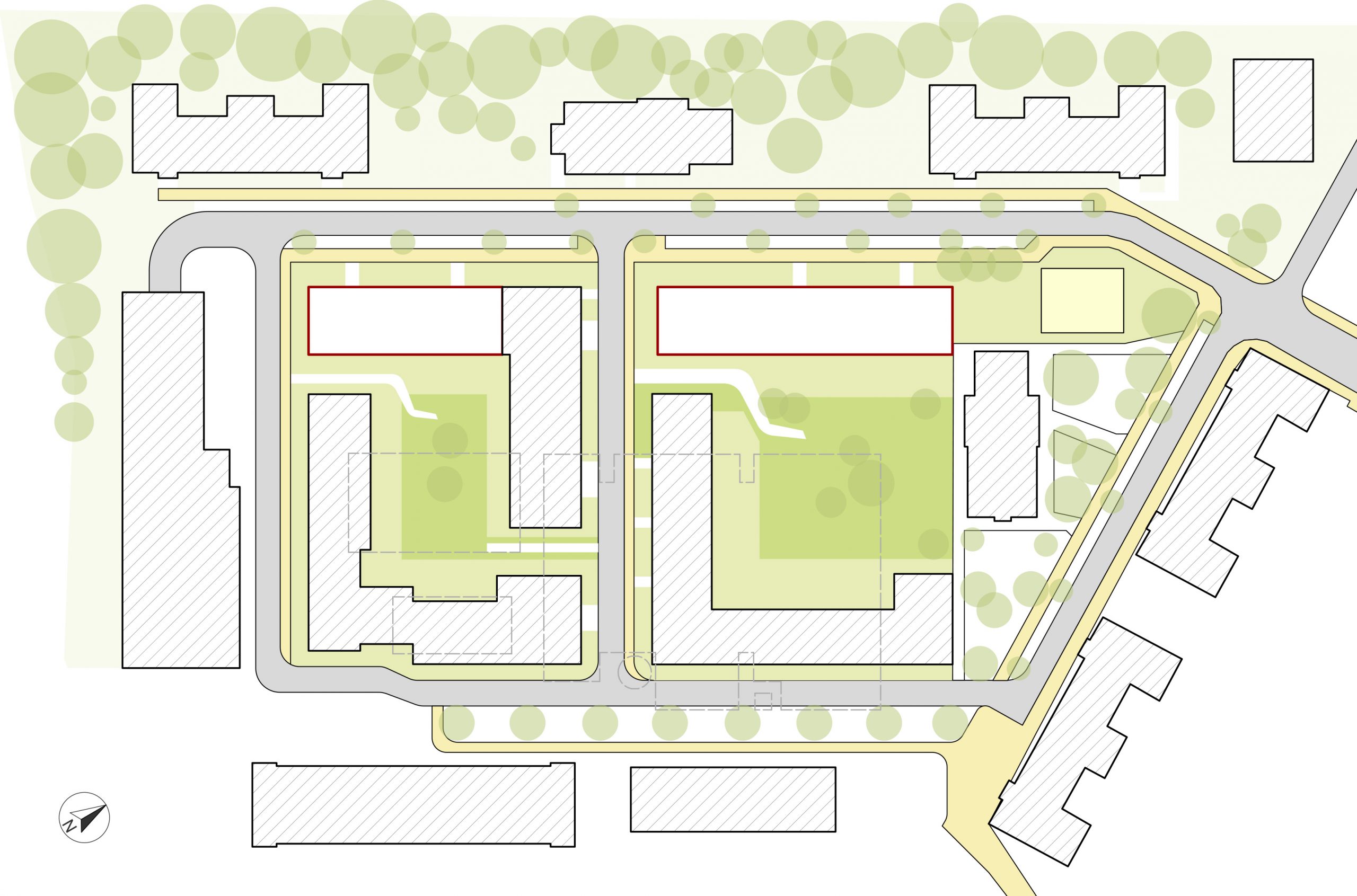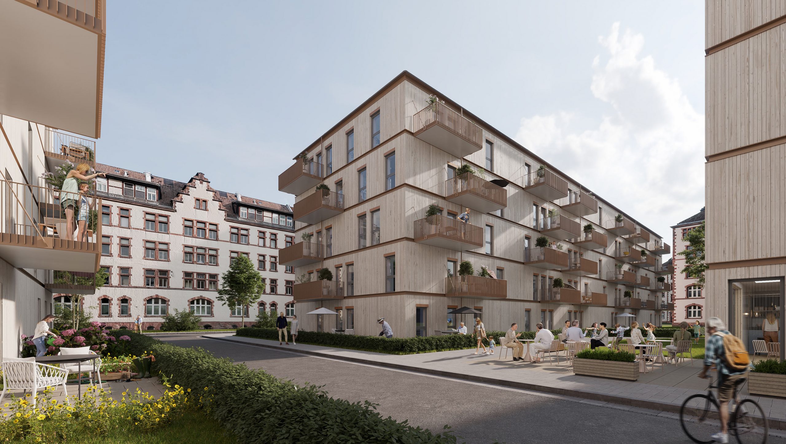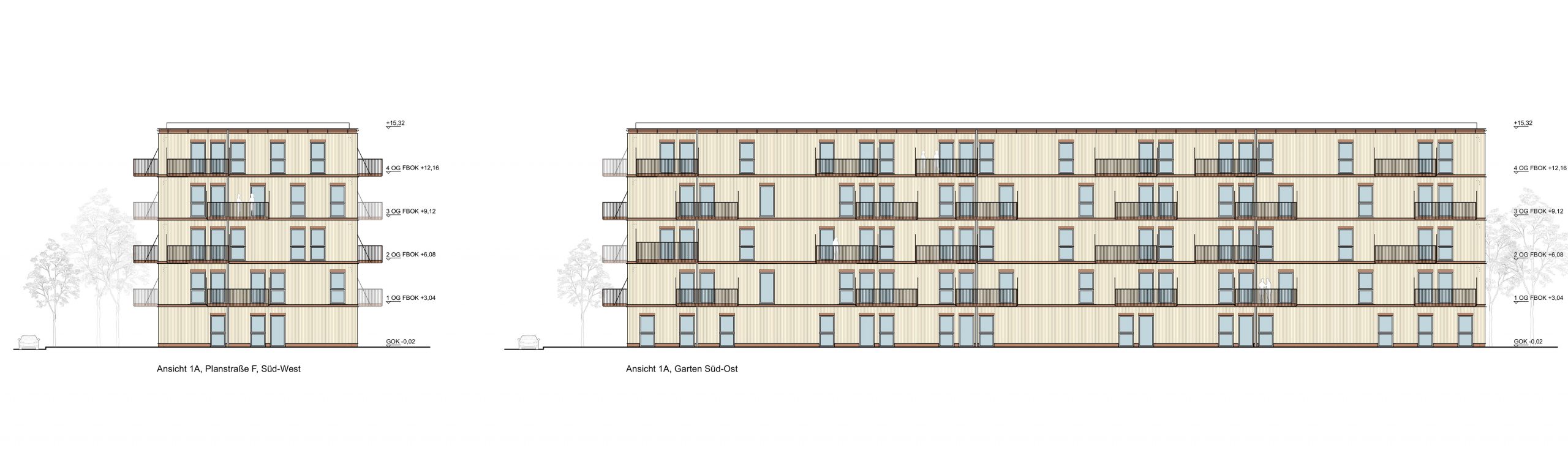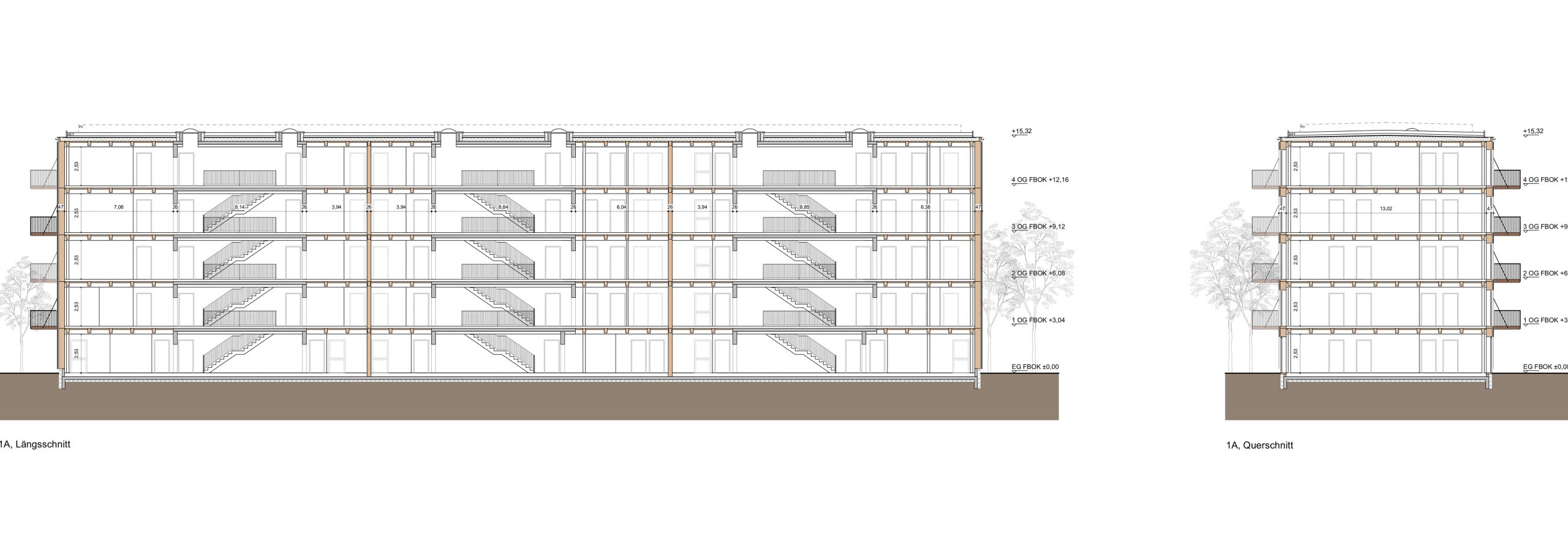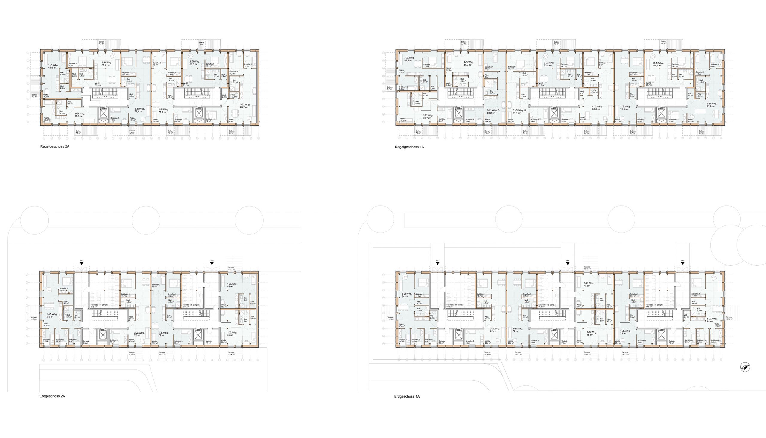 Geplant sind zwei fünfgeschossige Baukörper mit insgesamt 80 Wohnungen. Die kompakte und wirtschaftliche Grundrissorganisation basiert auf einem modularen Systembauprinzip mit identischen Regelgeschossen und abweichenden Erdgeschossen. Alle Gebäudeabschnitte verfügen über zentrale, helle Treppenhäuser mit barrierefreier Erschließung. Großzügige Foyers, gemeinschaftlich genutzte Fahrradräume und klar strukturierte Zugänge fördern Orientierung und Nachbarschaft.